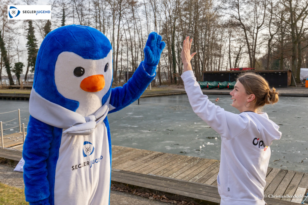 In den anschließenden Workshops ging es um den Einstieg ins Seesegeln, Mentales Training und das Juniorteam als Weg ins Ehrenamt für junge Menschen. Zwischendurch stand das Gruppenfoto vor dem gefrorenen Wolziger See auf dem Programm. Star des Fotos war natürlich Seglerjugend-Maskottchen „Skippi“.